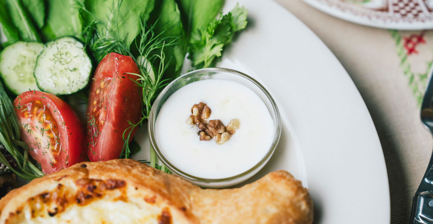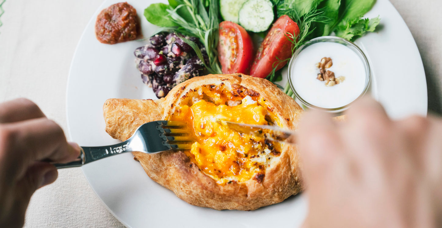 ジョージアの朝ごはんは、ジョージアを代表するチーズパン「ハチャプリ」に、赤インゲン豆とくるみのペースト、ハーブ、スパイスを和えた「ロビオ」、トマトときゅうり、ルッコラ、ハーブを盛り合わせたサラダ、唐辛子を使用した万能ソース「アジカ」、コーカサス地方発祥の発酵乳製品「マツォーニ」を合わせたワンプレート。