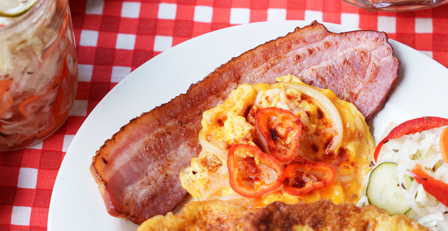 ハンガリーの朝ごはんは、パンを卵と牛乳に浸して焼いたハンガリー風のフレンチトースト「ブンダーシュ・ケニェール」に、ハンガリー風のオムレツ「トヤーシュ・ラーントッタ」、燻製ベーコン、カッテージチーズに粉末パプリカなどを加えたスプレッド「クルズット」、サワークリーム、ピクルス「チャラマーデー」を添えたワンプレート。随所にハンガリーの定番食材である「パプリカ」が使用されています。その他、ハンガリーで元旦の日に食べる縁起の良い煮込み料理「レンチェ フーゼレーク」やりんごのデザート「アルマーシュ・レーテシュ」など、ハンガリーならではのサイドディッシュやデザート、ドリンクもご用意しました。